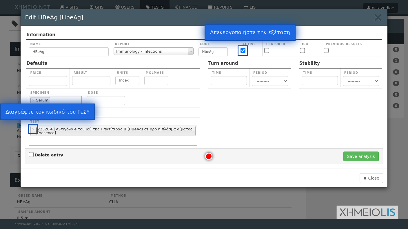 Αν η εξέταση είναι HBeAg, απενεργοποιήστε την (να μην είναι Active) και διαγράψτε τον κωδικό του ΓεΣΥ.