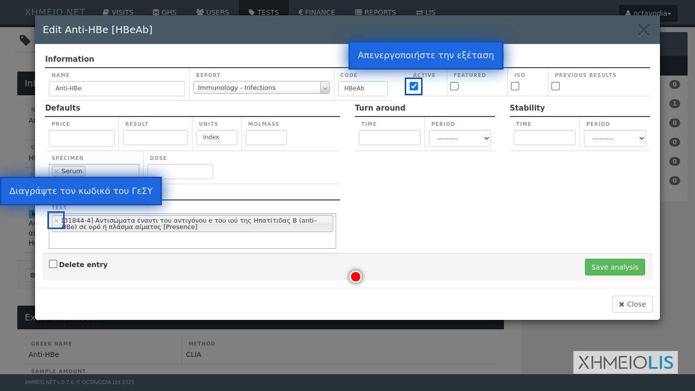 Αν η εξέταση είναι η anti–HBe, απενεργοποιήστε την (να μην είναι Active) και διαγράψτε τον κωδικό του ΓεΣΥ.