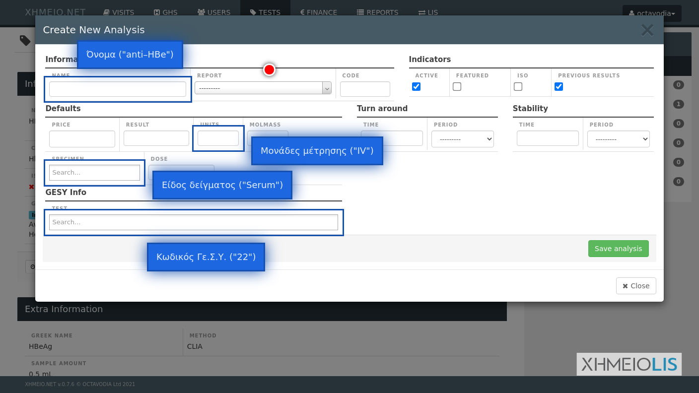 Για το ΓεΣΥ, προσθέστε τον κωδικό 22320-6. Μην ξεχάσετε να προσθέσετε το report στο οποίο θέλετε να φαίνεται η εξέταση, τις μονάδες μέτρησης, το είδος του δείγματος, την μέθοδο και τις τιμές αναφοράς.